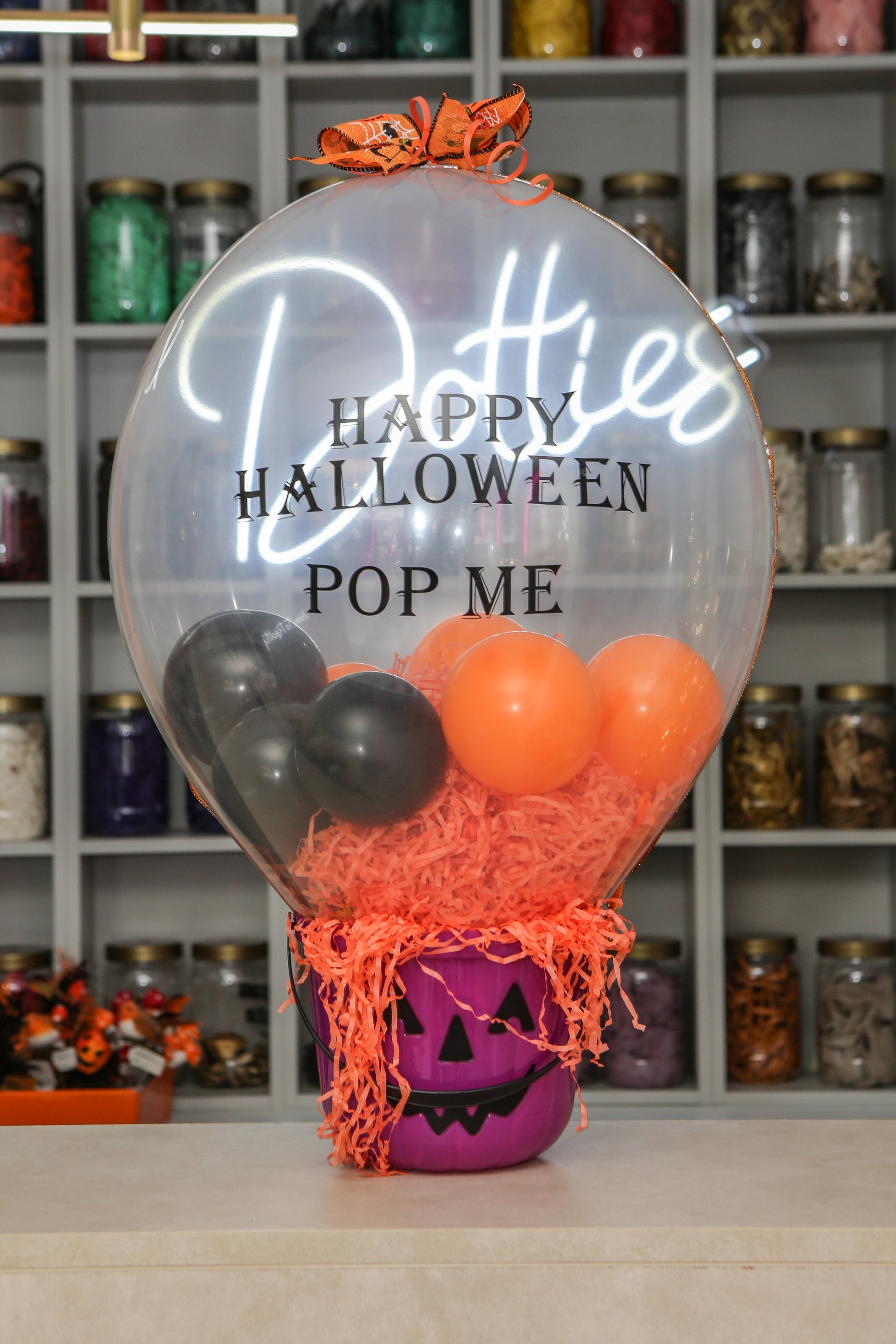 Make this Halloween extra spook-tacular with our Halloween "Pop Me" Balloon Surprise! π Hidden inside this clear balloon are delicious sweets, waiting to be released when you pop it open. Decorated with festive black and orange mini balloons, shredded paper, and sitting atop a cheeky purple pumpkin bucket, itβs the perfect mix of spooky fun and tasty treats.