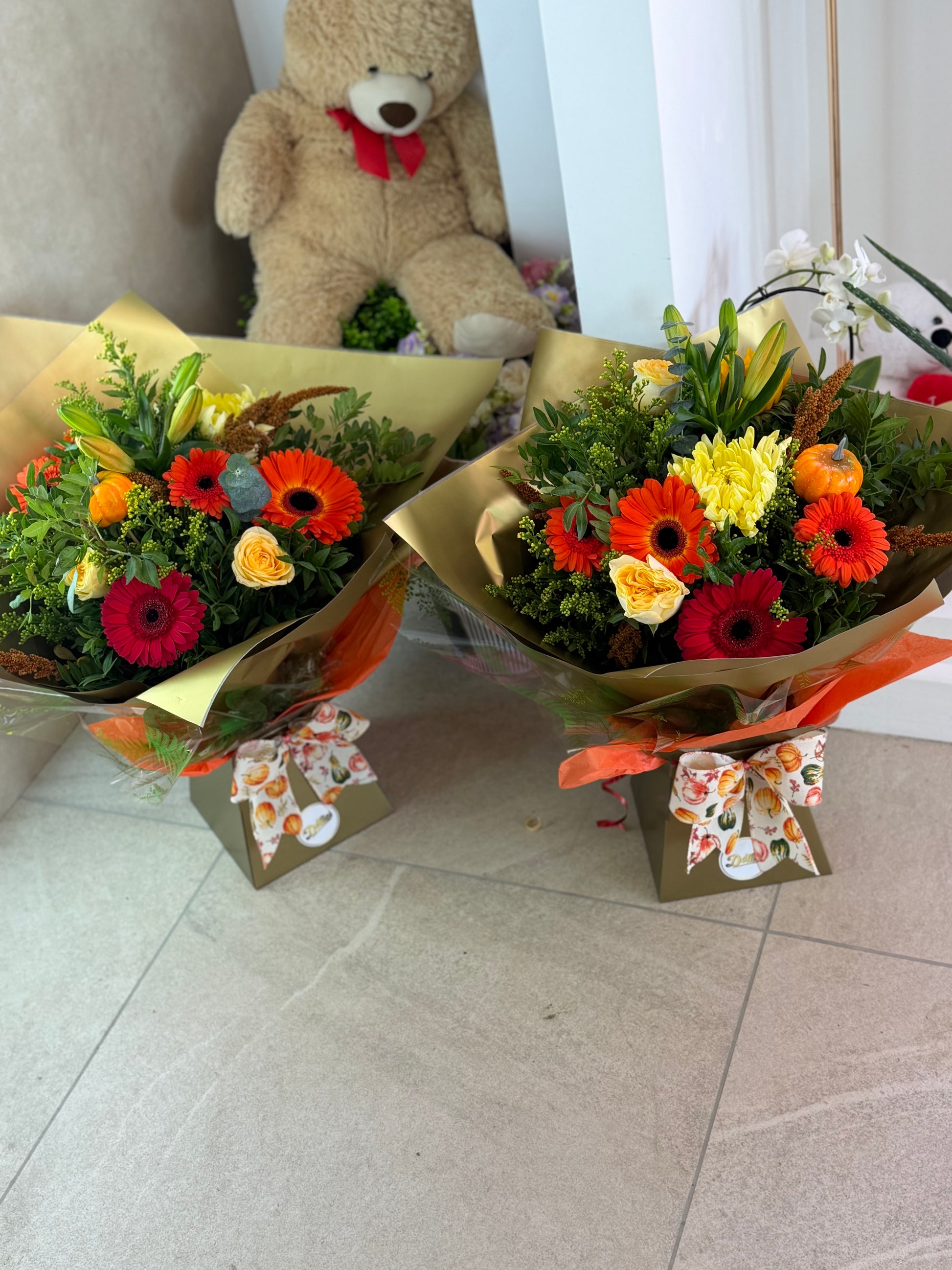 A radiant blend of golden yellows, fiery reds, and soft green accents — this bouquet captures warmth, joy, and elegance in every petal. Beautifully arranged and wrapped with care, it’s perfect for adding a touch of sunshine to any occasion